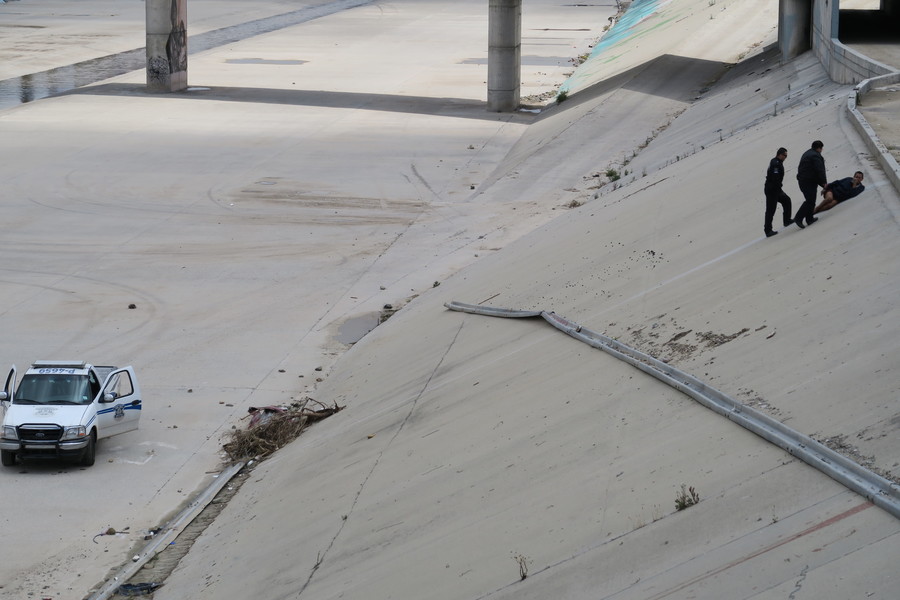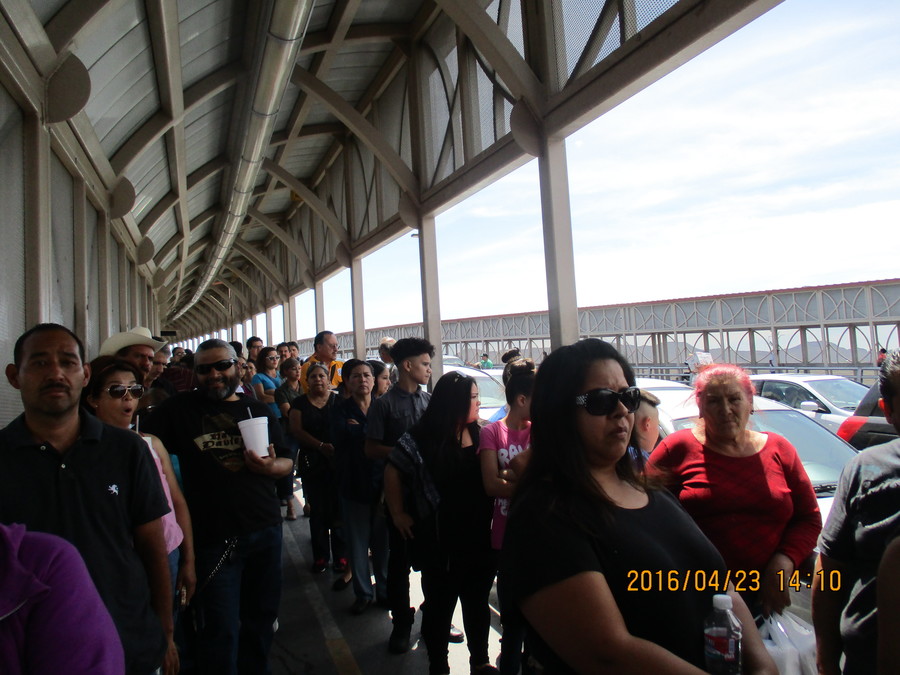 エルパソでの経験からメキシコから米国への入国審査は時間がかかることは承知していたので観光は早めに切り上げた。陸橋を渡り米国側入国管理事務所まで続いている行列に並ぶ。数百メートルの道は日除け屋根が設置されている。2列に並んでおり左側は米国市民、米国労働許可証所持者、身体障害者(handicapped person)と表示されている。健常者で米国以外のパスポート保持者は“それ以外”なので右側にならぶ。大勢の一般メキシコ人に混じって30分くらい並んでいたが一向に前に進まない。