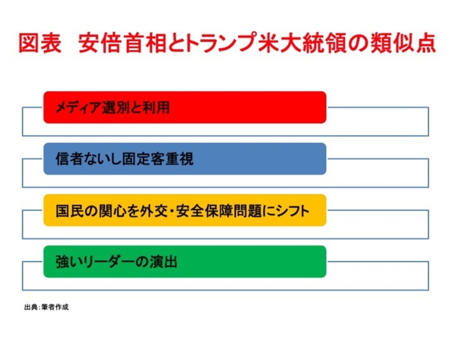 ちなみにゼミ生(3年生)に同様の質問を投げかけてみると、「トランプは移民とマイノリティ、安倍首相は民進党をスケープゴートにしている」「トランプ政権と安倍政権は共に集団思考の罠にはまった多様性の無い組織である」「国民に『強いリーダー』であることを示している」「国民の関心を国内から国外に向けている」及び「政権誕生の経緯が類似している」という回答が返ってきました。それらに加えて、安倍・トランプ両氏の類似点に「効果的なメッセージを発信している」「国民の不満を汲み取って代弁している」「考え方が右寄り」「軍事増強路線である」「メディアを敵視する」も挙がりました。本稿では、政治手法における両氏の類似点を探ってみます(図表)。