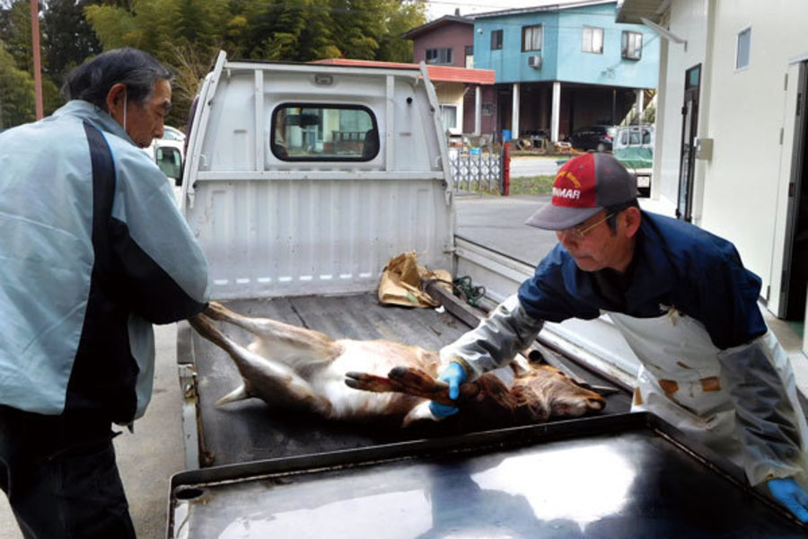 さっそく社員が集まって、食肉処理場に運び込む。重さを量ると70キロを超えた。「これは大物だな」。そんな声が響く。持ち込んだ人によると、畑に仕掛けたくくりワナに掛かっていたのだそうだ。まだ仕留めて30分と経たない。その後も次々とシカが運び込まれた。猟期中は1日10頭以上持ち込まれるという。