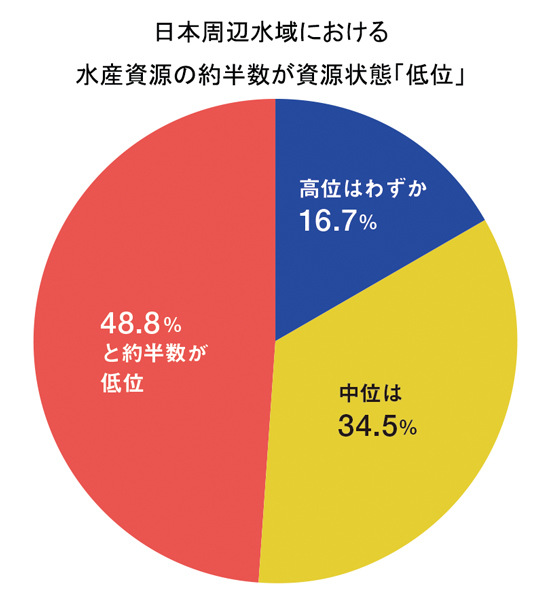 『水産白書』によると、日本の約50魚種84系群の資源状態のうち、約半数が資源量「低位」にある。