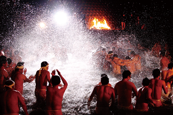 • 川をせき止めて作ったみそぎ場で水を掛け合う