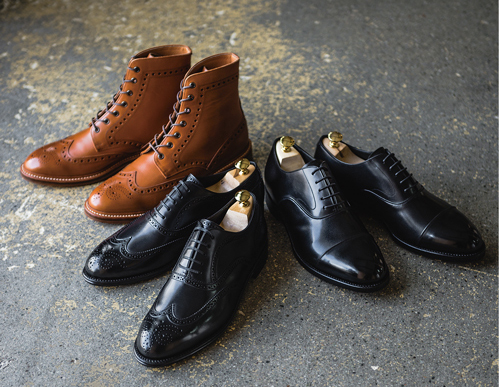 左からフルブローグブーツ(44,000円~)、フルブローグ(40,000円~)、ストレートチップ(40,000円~) *オーダー価格、税込