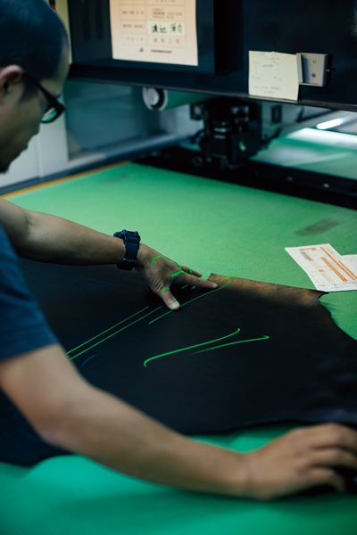 靴のアッパー(甲革)に使用する革にパソコンで型取りをして裁断する作業