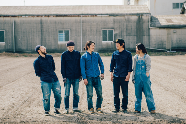 藍の苗を植える前の畑に立つBUAISOUの面々。堆肥には納田さんの豚の糞が使われる。左から、三浦さん、結城さん、楮さん、小薗さん、グウェンさん。グウェンさんは3月で母国シンガポールへ帰った