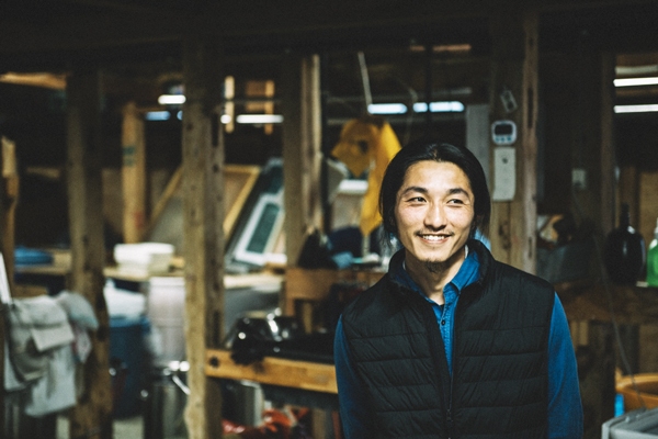 (写真上右)地元でBUAISOUの兄貴的存在の納田明豊〈のうだあきとよ〉さんと長男の歩くん、柴犬まめ(♀)。