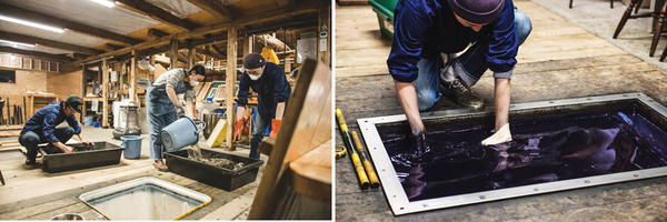 (写真左)黙々と染め液の仕込み作業を行う仲間たち。その顔は実に楽しそうだ