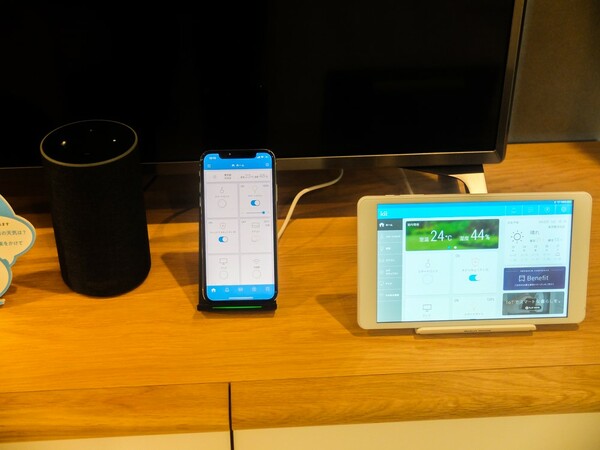 • セントラル コントローラー、中)スマホ、左)Amazon Echo