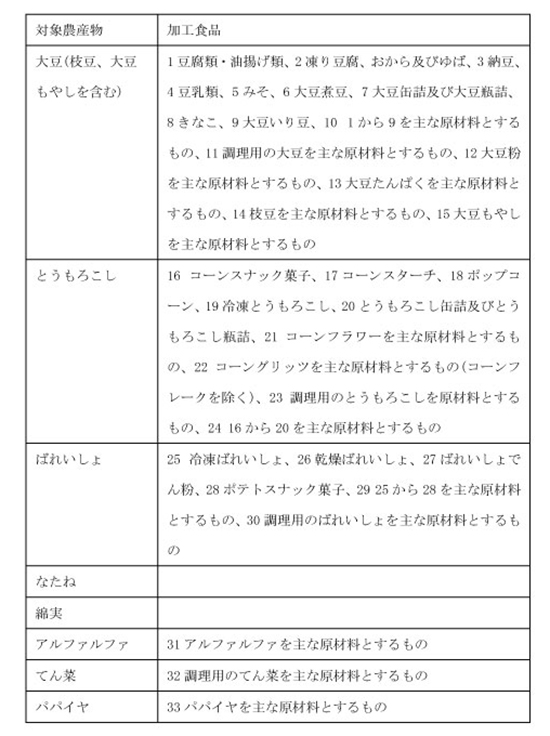遺伝子組換えの表示義務対象品目(8農産物と33の加工食品)