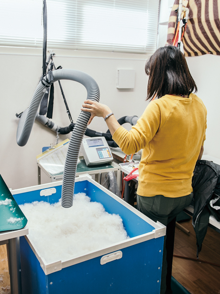 (写真右)ダウンの品質見本。ダウンとはグース(鵞鳥)とダック(家鴨)の羽毛で、柔らかなグースの比率が多いと保温性に優れ、硬いダックの比率が多いと弾力性があり回復力も高い