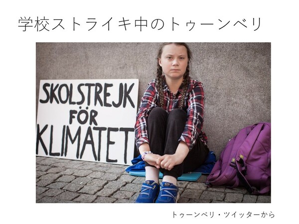 • ストックホルムの議事堂前に「School strike for the climate」看板を手に立つグレタ・トゥーンベリさん(TT News Agency/AFLO)