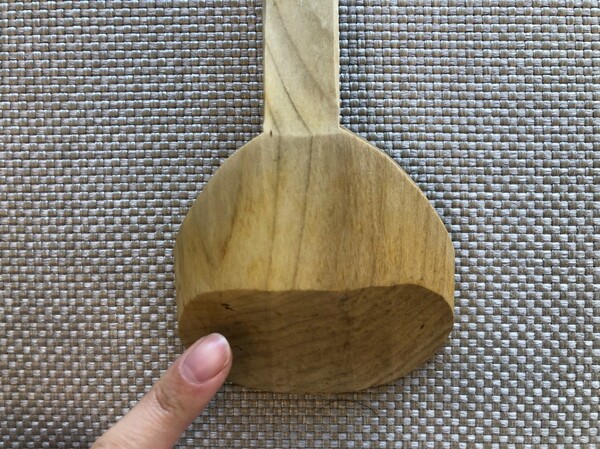 また、裏を返すと平たくなっており、食材の裏漉しにも使える2wayの機能的な杓子。木工用品の仕上げは紙やすりを用いることが一般的になってきているが、有道杓子の仕上げには紙やすりは使わない。鉋で仕上げるので木が毛羽立たず、平に仕上がる。そのため、繊維の中に水分や素材が入り込みにくくなり、長持ちの秘訣なのだそう。ちなみに、素材は朴の木でできており、農閑期の冬の仕事として発展したと言われている(写真提供:筆者)