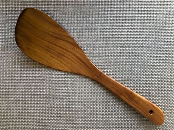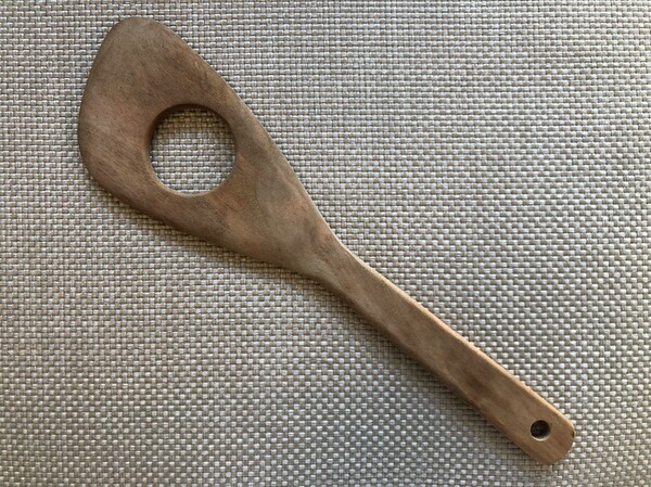最近頂いた、作家さんが作った桜の木のフライ返し。真ん中に穴が空いているのが優れもので、炒め物などに最適(写真提供:筆者)