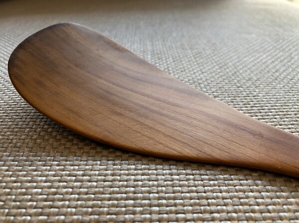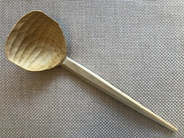 岐阜県・高山市の有道杓子(うとうしゃくし)の職人さんが作ったもの。こちらはまた少し用途が異なる。職人さんが実演してくださった際に話を伺ったのだが、金属製のおたまとは違って木製なので具材に刺さることがなく、煮物などに最適。食材を大切に料理できるのだ(写真提供:筆者)