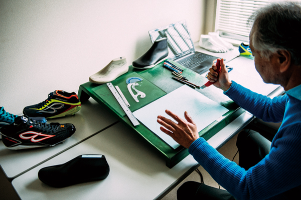 (写真左)足の小指、薬指、親指の順に体重を誘導し、着地の衝撃をやわらげて推進力に変えるソールの3本のバー。硬度の異なるパーツを組み合わせるなど複雑な靴底設計のため、製造には職人の技が必須