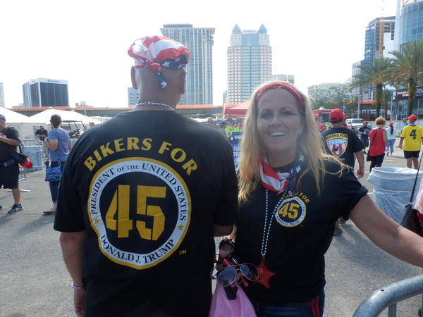 「第45代米大統領を支持するバイクの愛好家」の団体に所属するアリーさん(右)(海野撮影@フロリダ州オーランド)