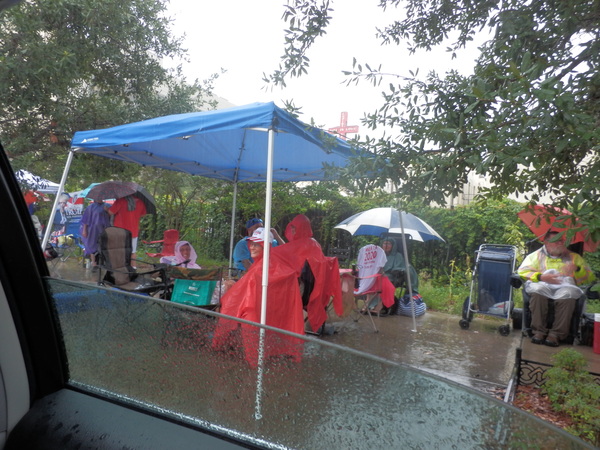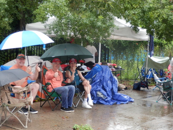 スコールの中テントを張って前日から並ぶトランプ支持者(海野撮影@フロリダ州オーランド)