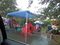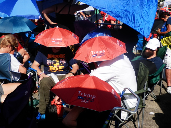 トランプ支持の傘をさして日差しを避けるトランプ支持者たち(海野撮影@フロリダ州オーランド)
