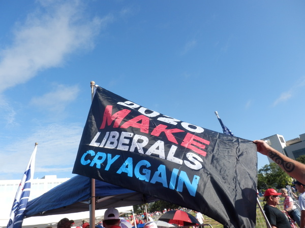 「2020年米大統領選挙でリベラルを再び泣かせよう」と印刷された旗(海野撮影@フロリダ州オーランド)