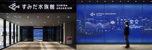 • すみだ水族館のエントランス。エッチングのような描画が浮かび上がり海中に誘われるよう 中道 淳=写真