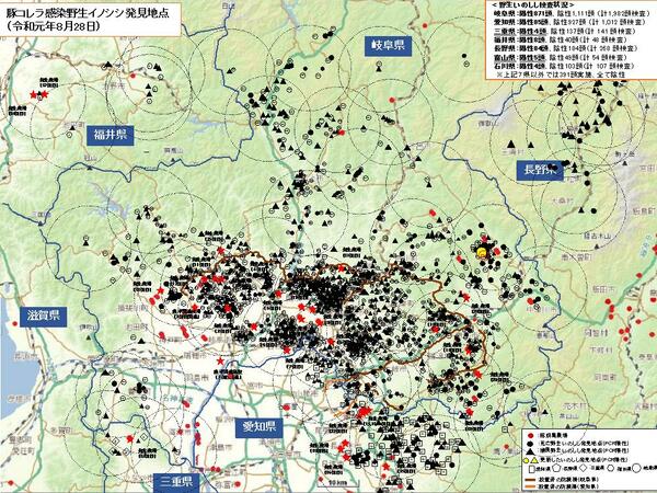 岐阜県で発生した豚コレラは1年かけて広がり、この夏には北陸三県で野生イノシシの感染が確認され、福井県では豚も感染した。そのため、全国の養豚関係者が警戒を強めている(出典:農水省資料)