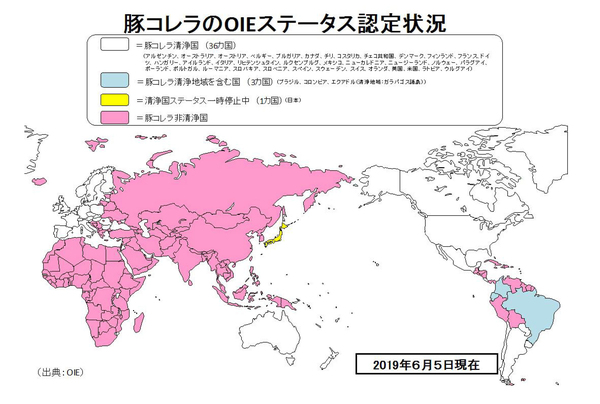 ユーラシア大陸やアフリカの多くの国が、豚コレラ非清浄国と位置づけられている(出典:農水省資料)