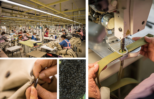 (写真左上)各パーツの縫製やアイロン掛け、製品検査などパートごとに分れて作業する。一人ひとりが職人だ