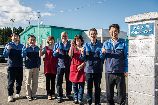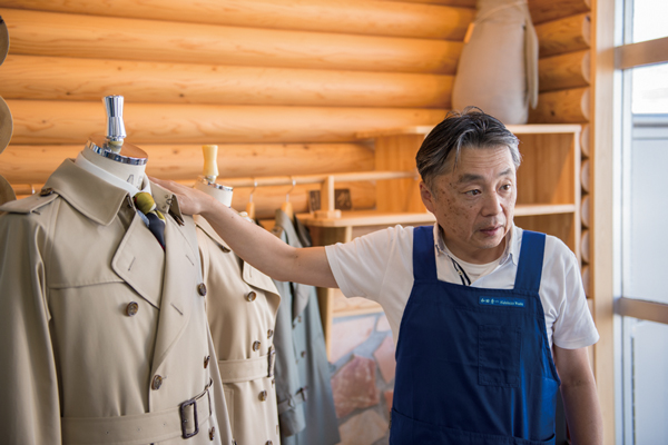 「コートは機械だけではなく人の目と手がなくては出来上がりません」と社長の横井享さん(中央)
