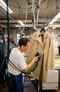 空中プレス仕上げ。一枚一枚、裏地からゆっくり時間をかけて熱を通して、表地を傷めずにシワを伸ばす