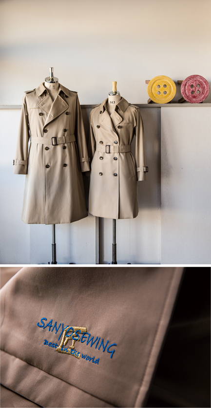 (写真上)サンヨーソーイングのコート作りの技術を極めたトレンチコート。最高品質のギャバジン(織物)を使用。ライナー付きで3シーズン着用可。工場直販とネット販売による完全受注生産で、納期は約1カ月。紳士6サイズ、婦人11サイズを展開。70,000円(税別、送料別)