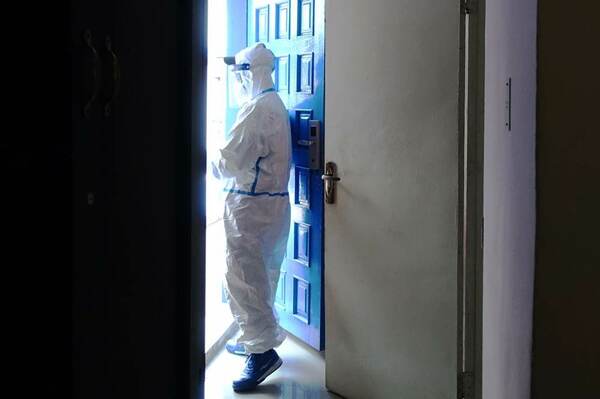 朝、検温を受ける筆者(右)通常は朝、晩2回だが、37℃以上になると1時間おきに