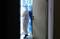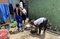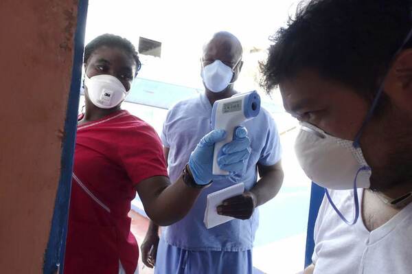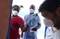 防護服にフェイスマスク着用で部屋の中に入る職員。リベリアでこの格好では、汗が噴き出して大変だ