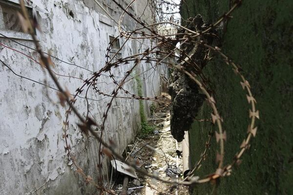 「ホテル」(左)と外壁の間には鉄条網があり、荒れ放題だった