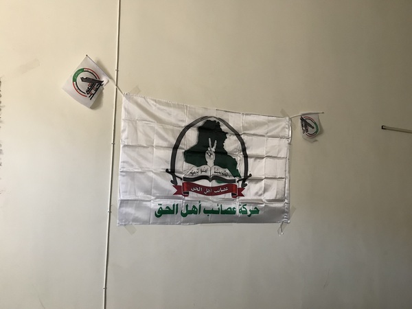 博物館内にあったシーア派政治組織、アサイブ・アル・ハックの旗