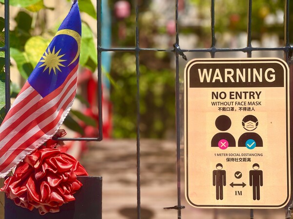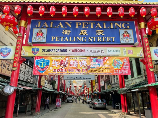首都クアラルンプール中心部のチャイナタウン付近の一角 例年春節の時期は大勢の観光客や地元の人で賑わうが、今年は門が閉ざされ「NO ENTRY」の看板が貼られていた