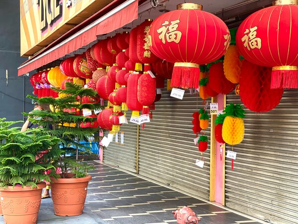 左:春節仕様の飾り物を販売する店も、コロナ禍でシャッターを閉じていた