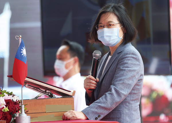 • 今年4月、台湾の輸送揚陸艦「玉山」の進水式に出席する蔡英文総統 (AP/AFLO)