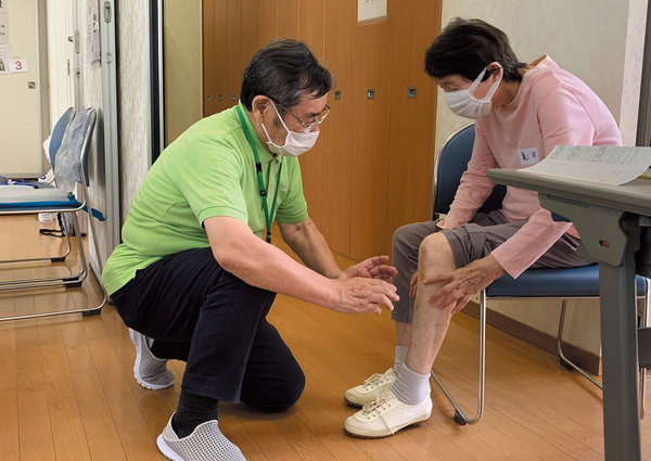 • フレイル度を自身で測る「指輪っかテスト」を実施する参加者とサポーター (WEDGE)