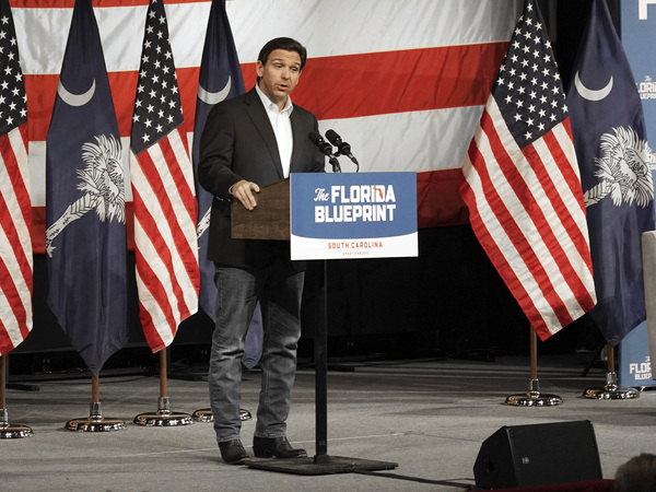 • 4 月 19 日、サウスカロライナ州スパータンバーグで演説するデサンティス氏(AP/AFLO)