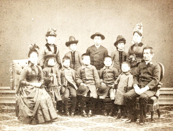 • 洋装した家族写真。庄三郎(右端)と妻寿子(左端)には6男5女がいた