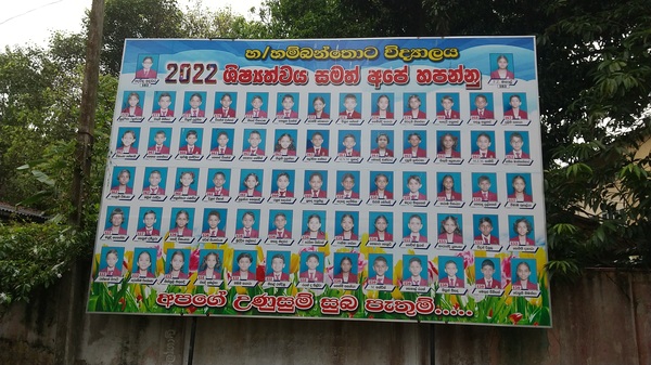 ハンバントタ市内の比較的レベルの高い公立学校(11年制)の正門横の2022年度の奨学金試験合格者祝賀の看板。23年の合格発表まで1年間掲示され る。260人中67人も合格したと主任教師は誇らしげに語った。校長以下幹部教師の 人事考課に影響があると