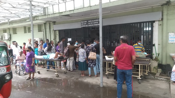 国立病院街の整形外科病棟待合室の前の軒下でストレッチャーに乗せられて待っている患者たち。手前の屋外待合スペースは満杯