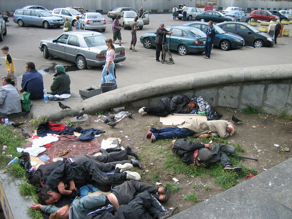 モスクワ市内の駅前で寝ているホームレス。ロシアでも夏場は野外で寝ても 寒くない。冬場はウオッカを呷って路上で倒れていたホームレスもいたが誰も声を掛けない