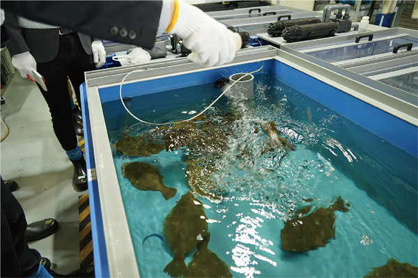 小誌記者が実際に餌料を撒いてみると、槽の底に寝そべっていたヒラメたちが勢いよく泳ぎ始めた。写真は、跳ねたヒラメが水面をひれで叩き、浴槽の水が飛び散ったときの様子である。その生き生きとした姿には驚かされた(WEDGE以下同)