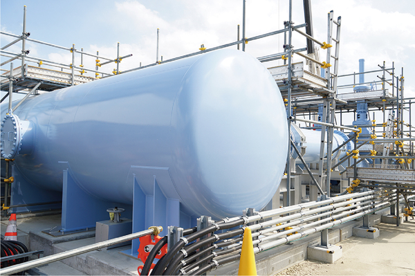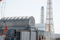 5・6号機の近くにある「グリーンデッキ」から見えた海際のタンク。まるで上から鷲掴みにして力強くひねったかのような、ななめ状のくぼみがタンクの下部を覆う。引き波にねじ曲げられたそうだ。生々しい津波の爪痕が今も残されている