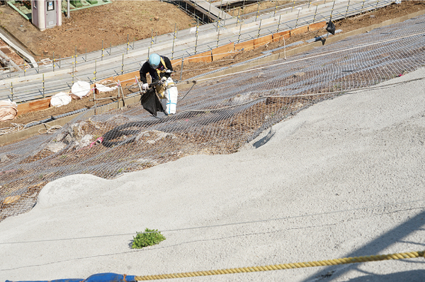 1〜4号機側の敷地では、地面に染み込んだ雨が地下水となって原子炉建屋内へ流れ込むことを防ぐため、コンクリートやモルタルで地面を固める「フェーシング」を施している(写真は参照、5・6号機側での作業の様子)