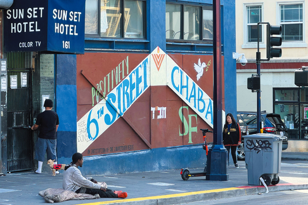 SFダウンタウンのホームレス。にぎやかな通りの近くでもこのような光景を目の当たりにした。米国の光と影を見た瞬間だった