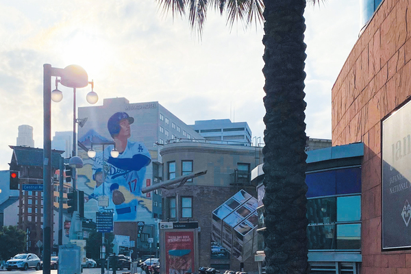 ロサンゼルス・ダウンタウンにある「リトル東京」のホテルの壁に描かれた大谷翔平選手の壁画。周囲はそれほど賑わっている様子はなかった