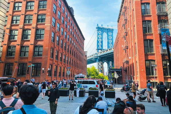 ニューヨーク・ブルックリンの「Dumbo(Down under the Manhattan Bridge Overpass)」地区。ビルの間から見えるマンハッタンブリッジは、ブルックリンのアイコンの一つで多くの観光客が訪れる