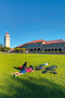スタンフォード大学の広場で寝転ぶ学生。奥にみえるのはフーバータワー。卒業生である、第31代大統領のハーバート・フーバーにちなんで、創立50周年に建てられた