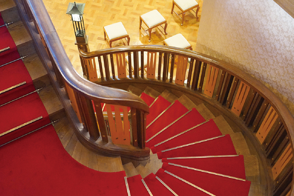 貞奴は赤い絨毯が敷かれたこの螺旋階段を使って2階から下り、大広間へ華々しく登場していた